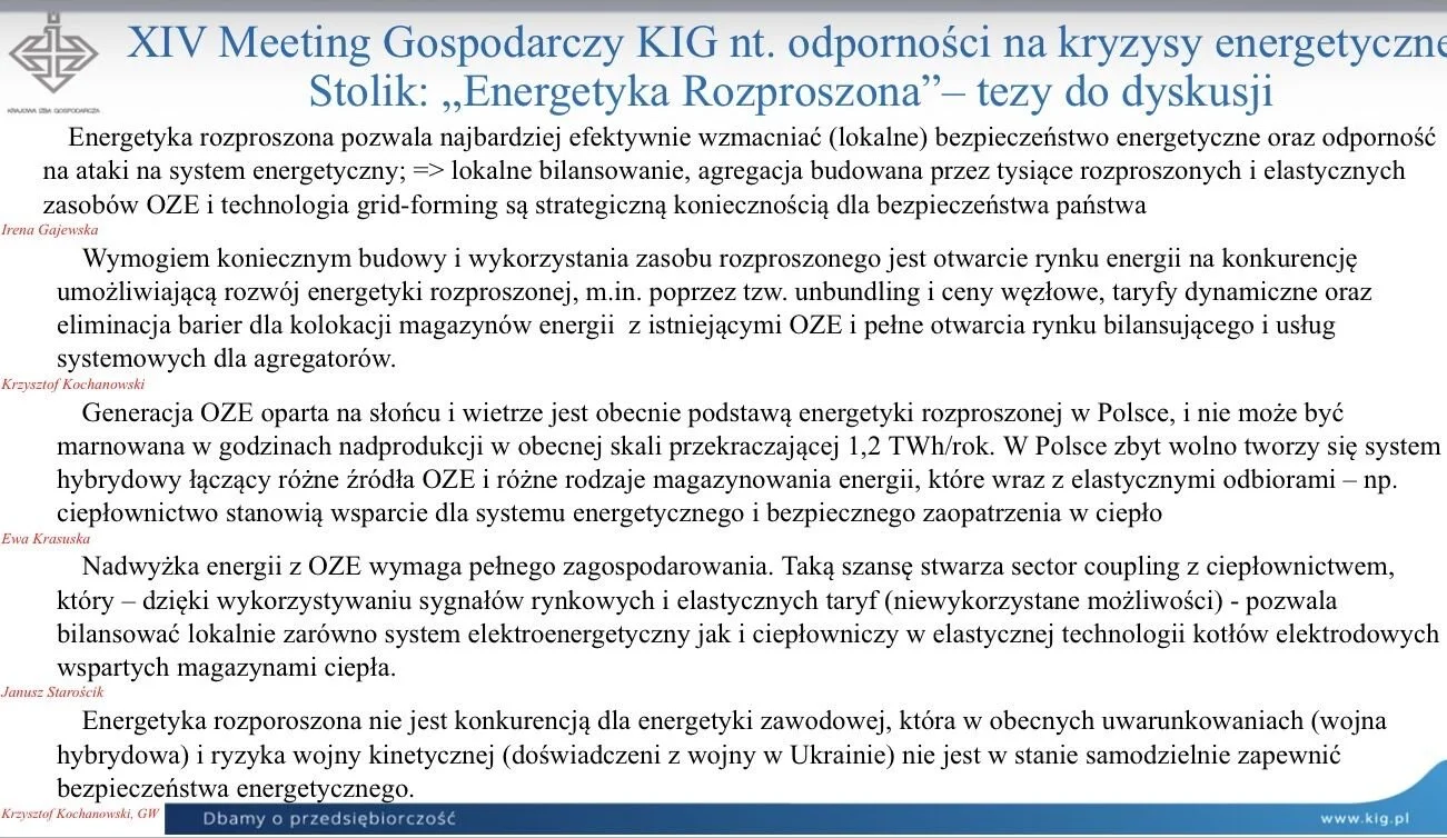 Swoje stanowisko zaprezentowały cztery stoliki tematyczne: energetyka tradycyjna, energetyka rozproszona, odbiorcy energii, nauka. Pani dr Ewa Krasuska podkreśliła w swoim wystąpieniu, że generacja OZE oparta na słońcu i wietrze jest obecnie podstawą energetyki rozproszonej w Polsce, profil produkcji energii słonecznej i wiatrowej doskonale uzupełniają się w ciągu roku. Obecnie wolumen nadprodukcji przekracza 1,2 TWh/rok. W Polsce zbyt wolno tworzy się system hybrydowy łączący różne źródła OZE i różne rodzaje magazynowania energii, które wraz z elastycznymi odbiorami – np. w ciepłownictwie, stanowią wsparcie dla systemu energetycznego i bezpiecznego zaopatrzenia w ciepło.